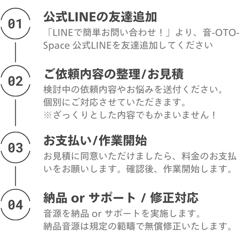 アコースティックは打ち込みで表現しづらい音になりますので、ぜひこの機会に生演奏の音源で楽曲を制作してみてはいかがでしょうか!お客様の悩みに寄り添ったご対応